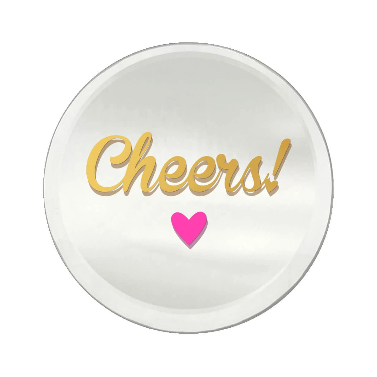 BESCHREIBUNGUntersetzer Liebevoll in Handarbeit veredelter Spiegel-UntersetzerMotiv: "Cheers!"Schriftfarbe: GoldGröße: 12 cmtolle Geschenkidee