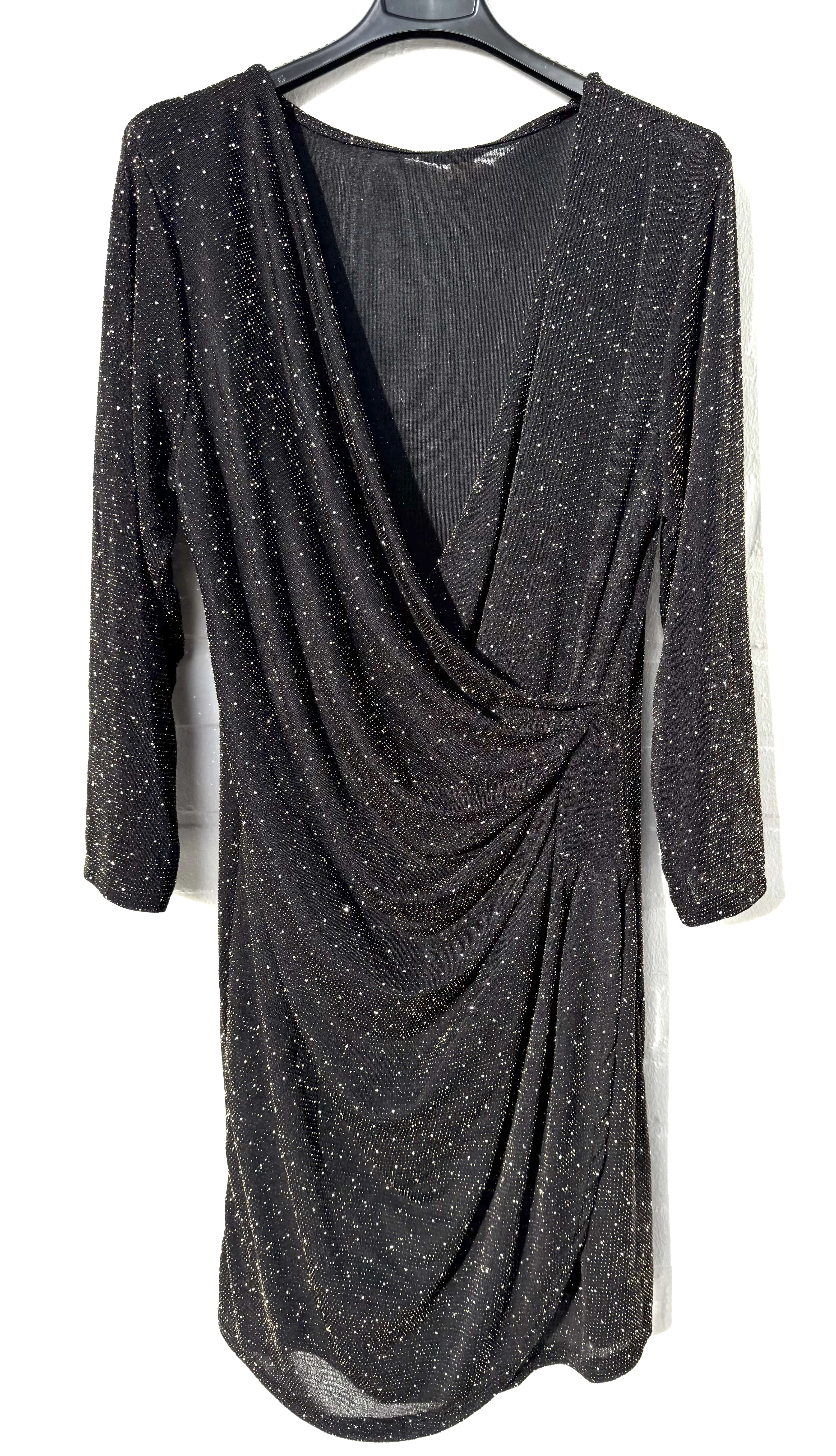 BESCHREIBUNG• Festliches Kleid mit kleinen Steinchen, Lurex• V-Ausschnitt, Raffung vorne, lange Ärmel• Größe: One Size (Gr.34-40)• Material: 95% Polyester, 5% Elasthan• Pfelgehinweis: 30 Grad Wäsche