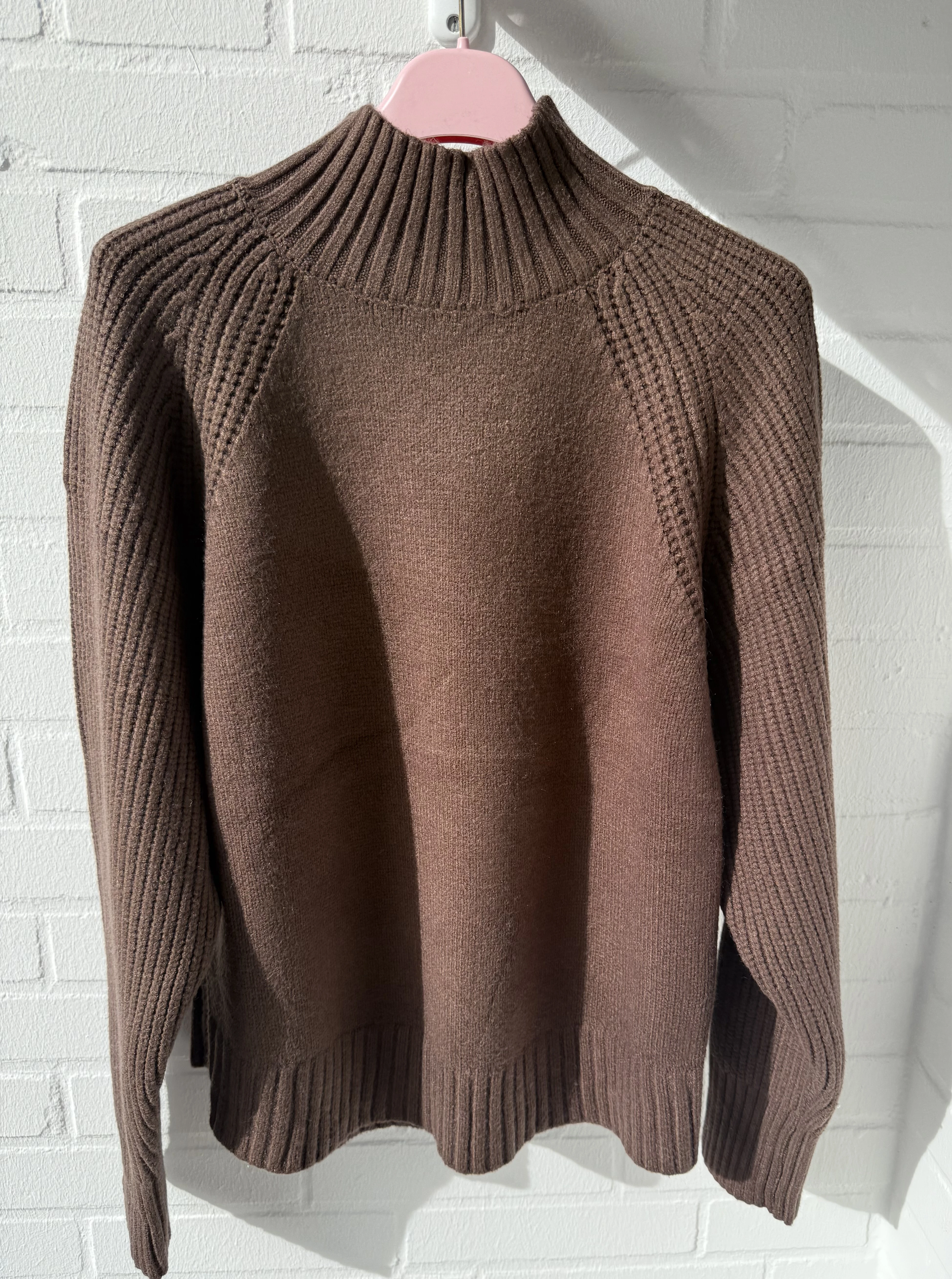 BESCHREIBUNG• weicher Pullover mit einem Stehkragen• lange Ärmel mit Bündchen• aufwendiges Strickmuster• Farbe: Nougat• Qualität: 35% Viskose, 35% Polyamid, 20% Acryl, 10% Elasthan