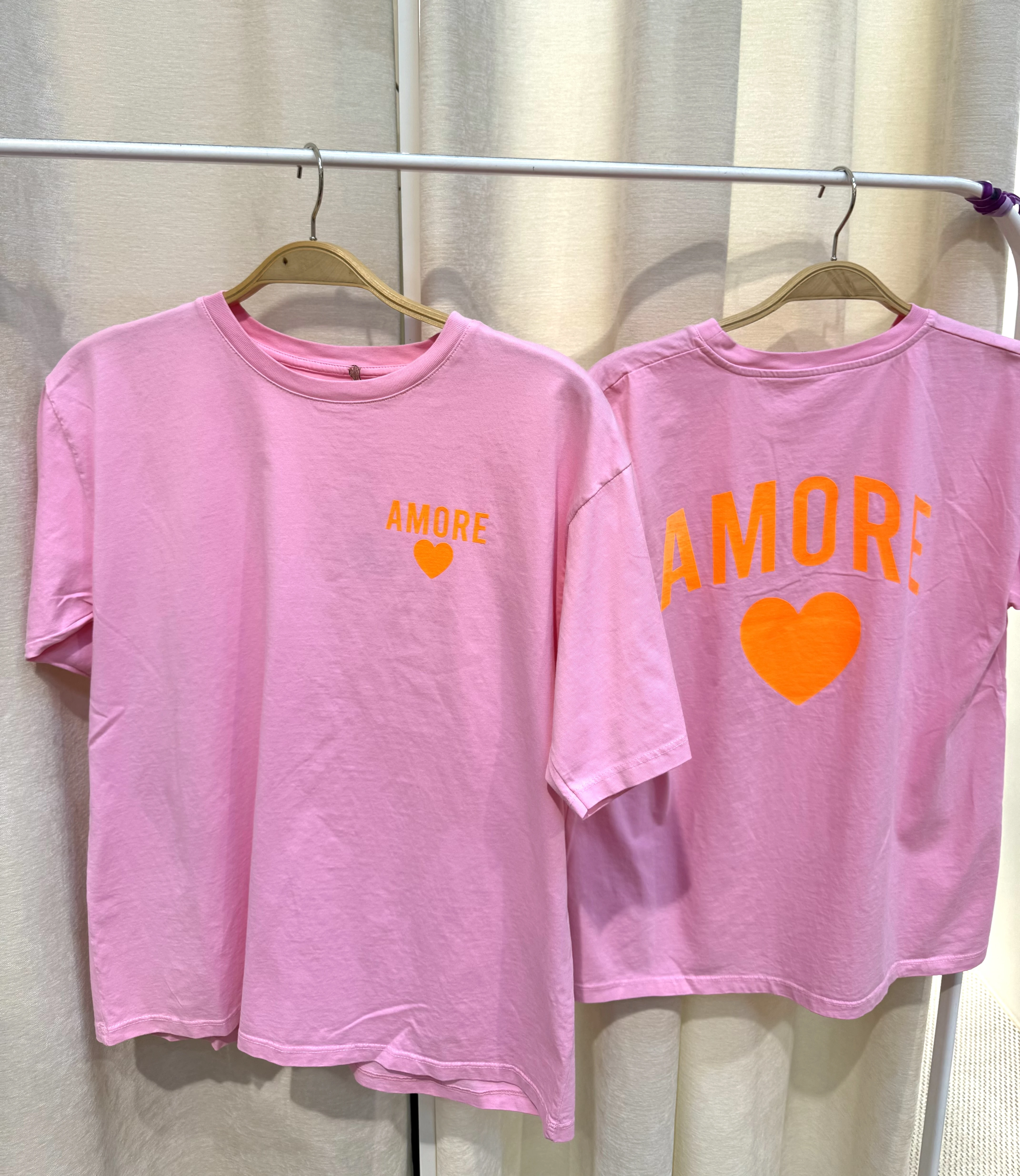 BESCHREIBUNG • Weiche T-Shirts mit einem orangen Druck auf der Vorder-und Rückseite • Größe: One Size (Gr.34-42) • Material: 100% Cotton • Pflegehinweis: 30 Grad waschbar, kein Weichspüler