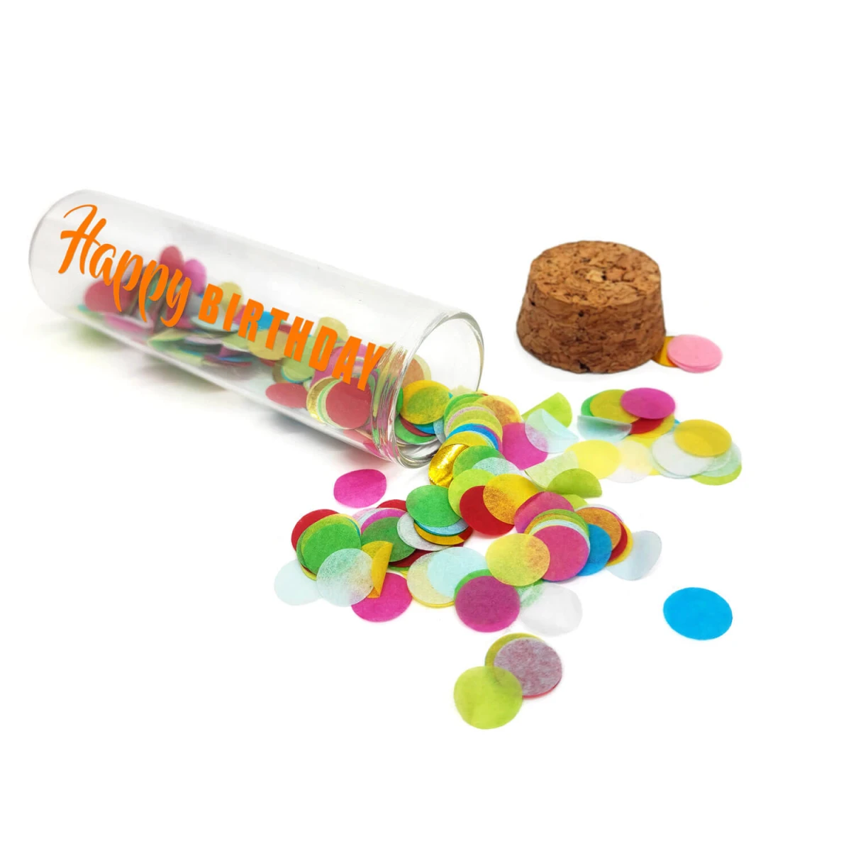 BESCHREIBUNG Geldgeschenk Röhrchen Motiv: "Happy Birthday" Schriftfarbe: Orange Konfettifarbe: Bunt Größe: Ø 3 cm x 10,5 cm Material: Glas & Kork Mit Liebe per Hand in Deutschland veredelt schöne Geldgeschenkidee zu jedem Anlass