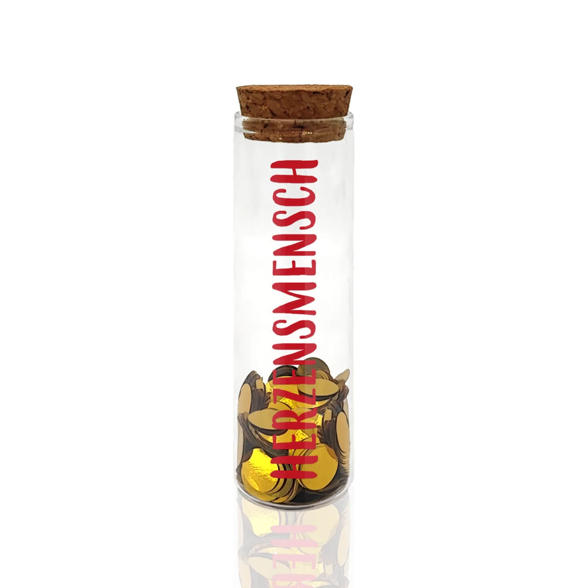 BESCHREIBUNG Geldgeschenk Röhrchen Motiv: Herzmensch" Schriftfarbe:Rot Konfettifarbe: Gold Größe: Ø 3 cm x 10,5 cm Material: Glas & Kork Mit Liebe per Hand in Deutschland veredelt schöne Geldgeschenkidee zu jedem Anlass