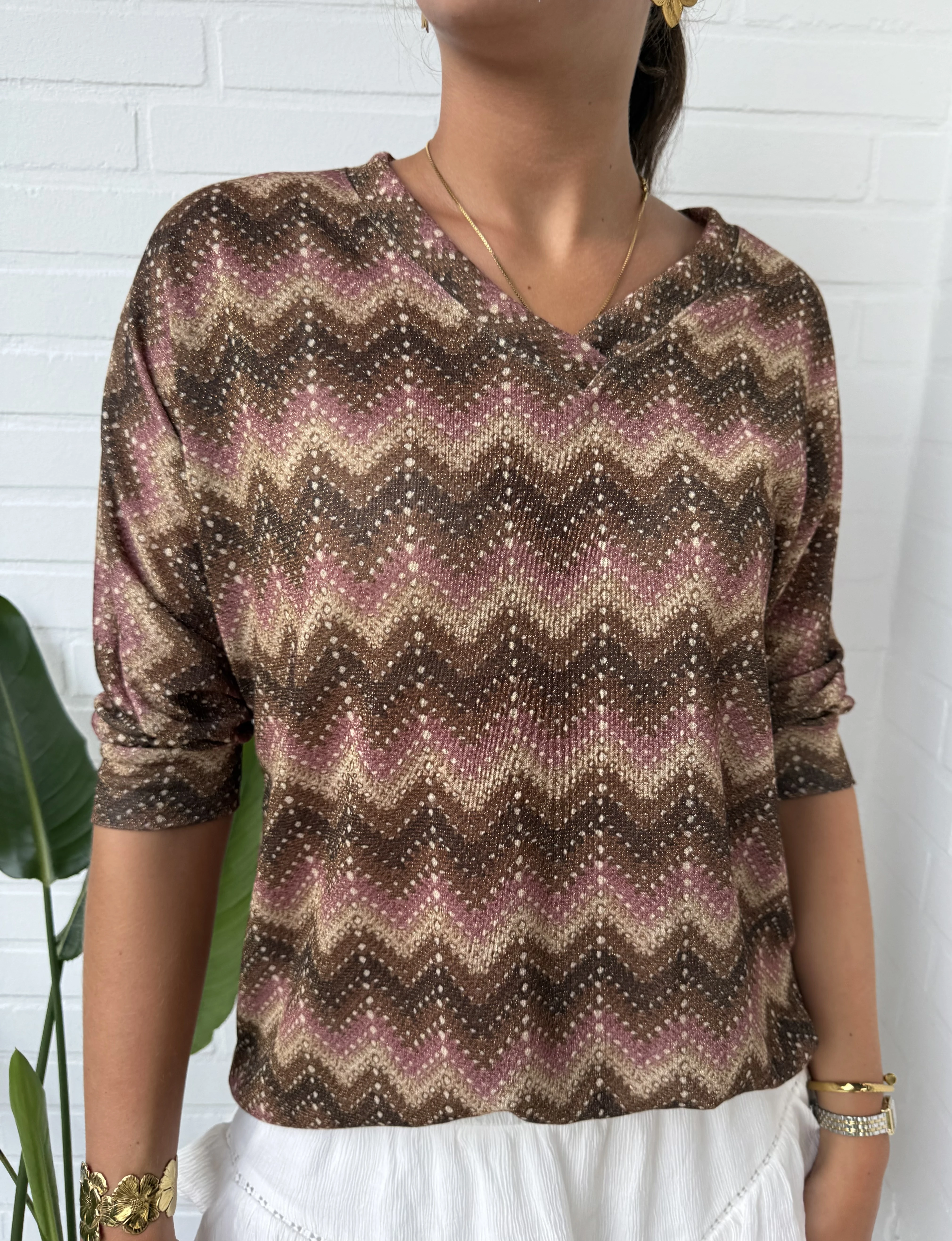 BESCHREIBUNG• super weiches Shirt mit einem V-Ausschnitt• kurzarm mit ZickZack.Muster• Größe: One size (Gr.34-42)• Qualität: 60% Viskose, 30% Polyester, 5% Elasthan, 5% Lurex