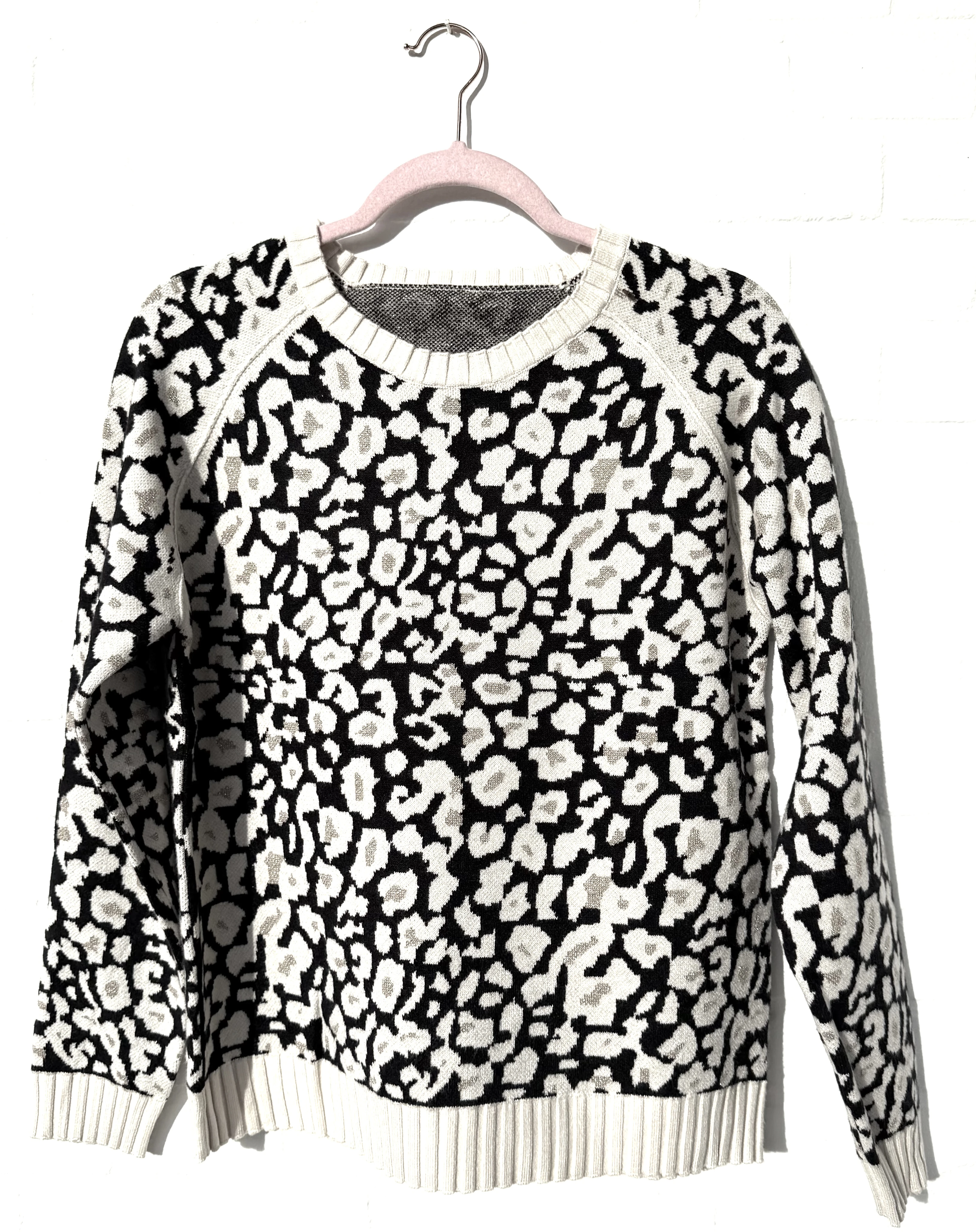 BESCHREIBUNG • Weicher Pullover mit einem Leomuster • Langer Ärmel, Bündchen an den Abschlüssen • Größe: One Size (Gr.34-40) • Qualität: 55% Viskose, 35% Polyester, 10% Elasthan • Pflegehinweis: Schonend im Wollwaschgang, ohne Weichspüler