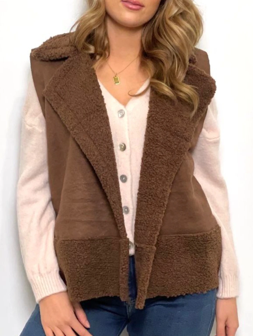 • Locker geschnittene Teddy-Weste • Kragen, offene Form • Größe: One size (Gr. 34-42) • Qualität: 100% Polyester • Pflegehinweis: 30 Grad Schonwaschgang, kein Weichspüler