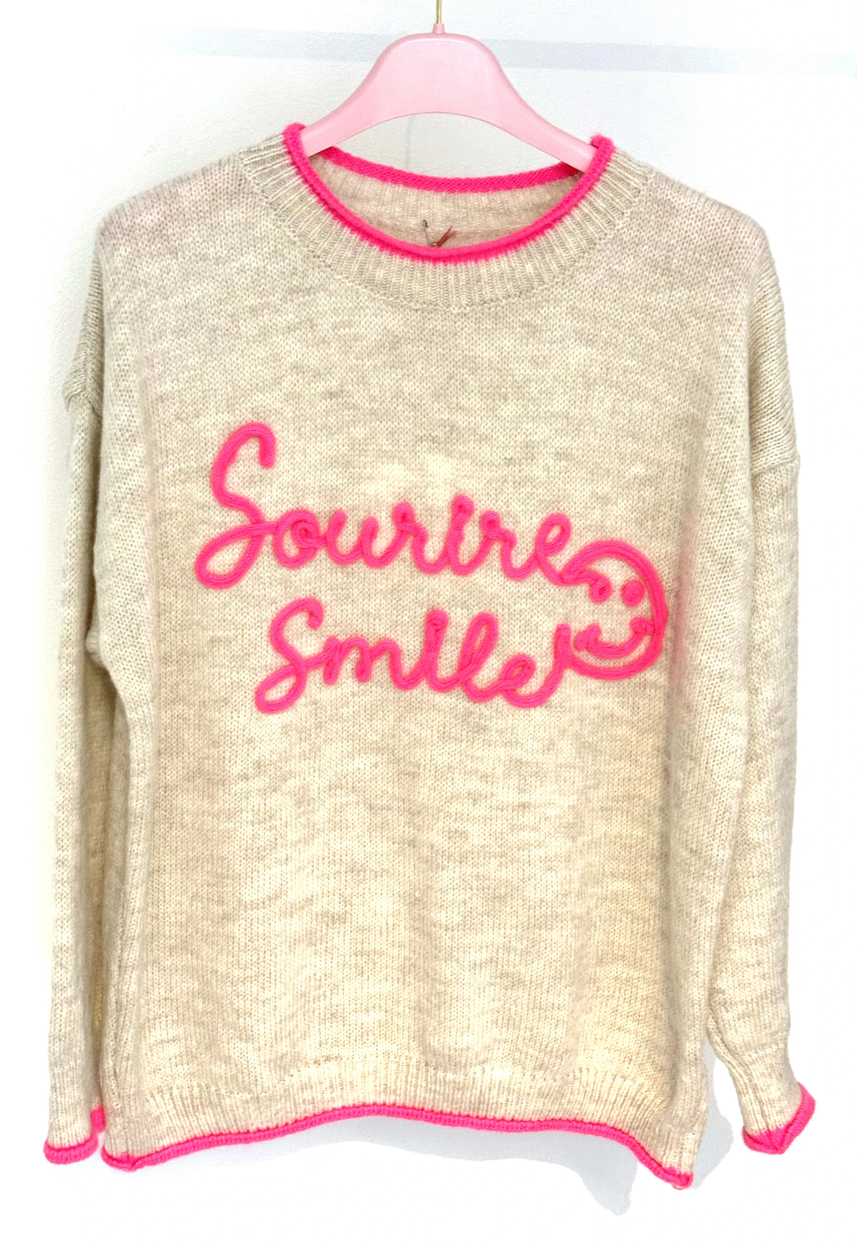 BESCHREIBUNG• Pullover mit einem Rund-Ausschnitt• Schriftzug aufgestrickt• Größe: One Size (Gr.34-42)• Neondetails in Pink• Material: 56% Acryl, 28% Polyamid, 8% Wolle, 8% Viskose• Pflegehinweis: 30 Grad Schonwaschgang, kein Weichspüler