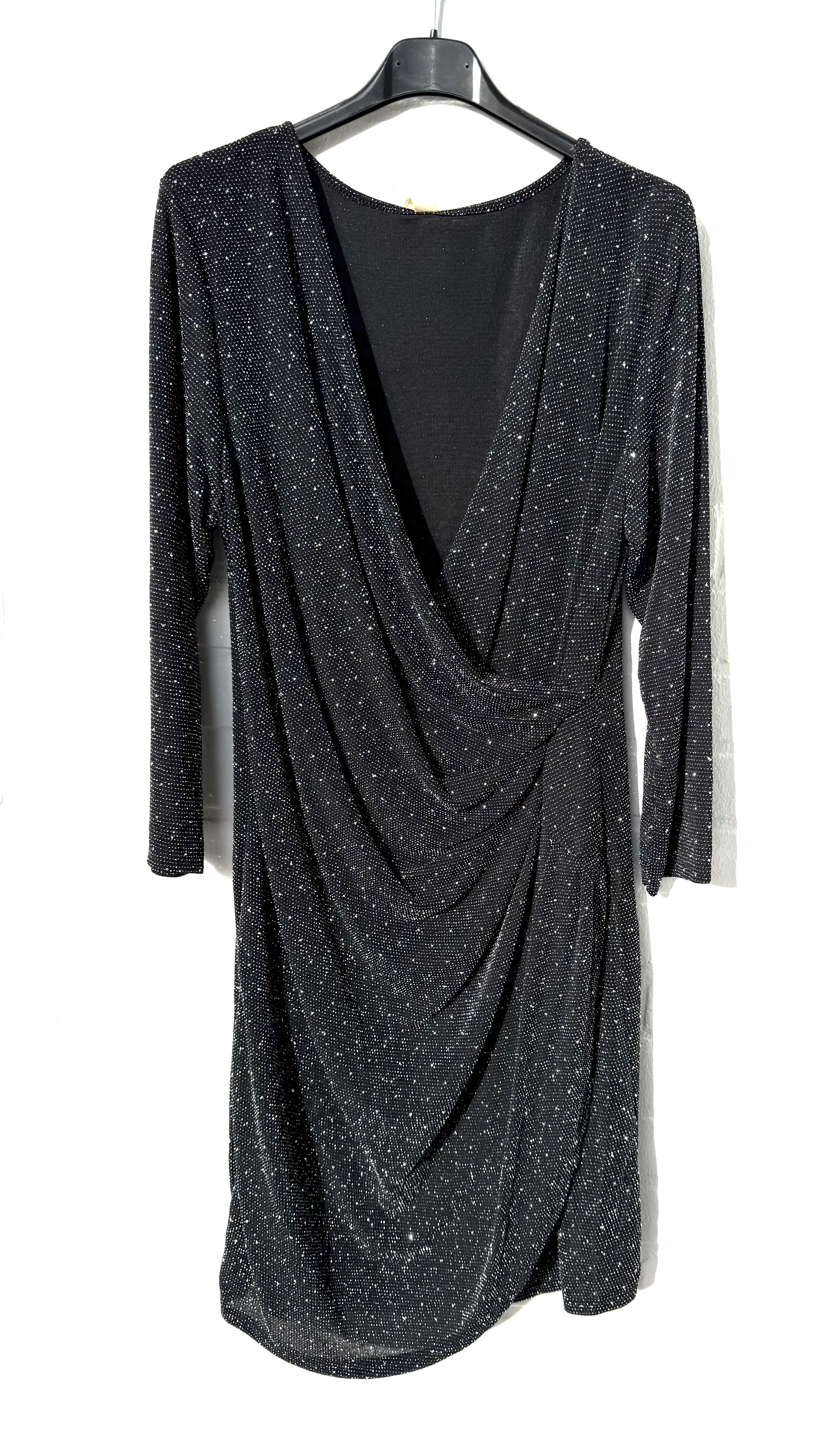 BESCHREIBUNG• Festliches Kleid mit kleinen Steinchen, Lurex• V-Ausschnitt, Raffung vorne, lange Ärmel• Größe: One Size (Gr.34-40)• Material: 95% Polyester, 5% Elasthan• Pfelgehinweis: 30 Grad Wäsche